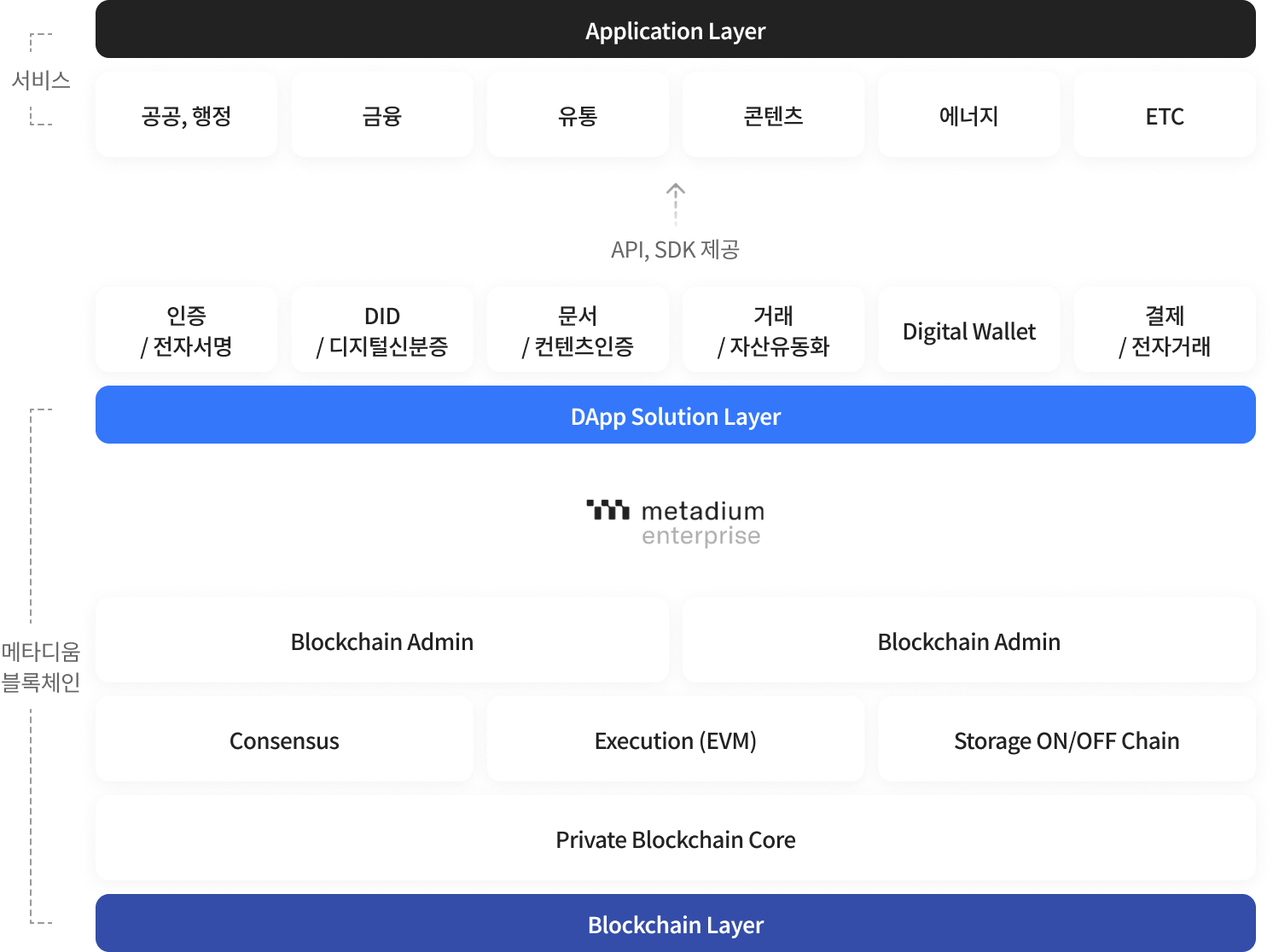 신속한 블록체인 서비스 개발을 위한 솔루션을 제공합니다. 기존 시스템에 구축 / SaaS / API·SDK를 제공하고,