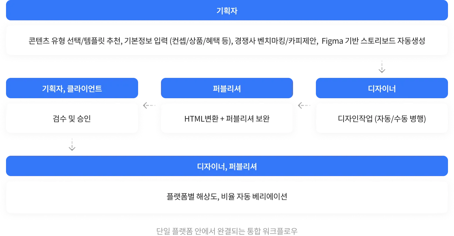 • 기획부터 디자인, 퍼블리싱까지 반복되는 작업 흐름을 AI가 자동화하고, 사람과의 유연한 협업을 통해 콘텐츠 제작 속도는 높이고, 품질은 유지하거나 향상시킵니다.