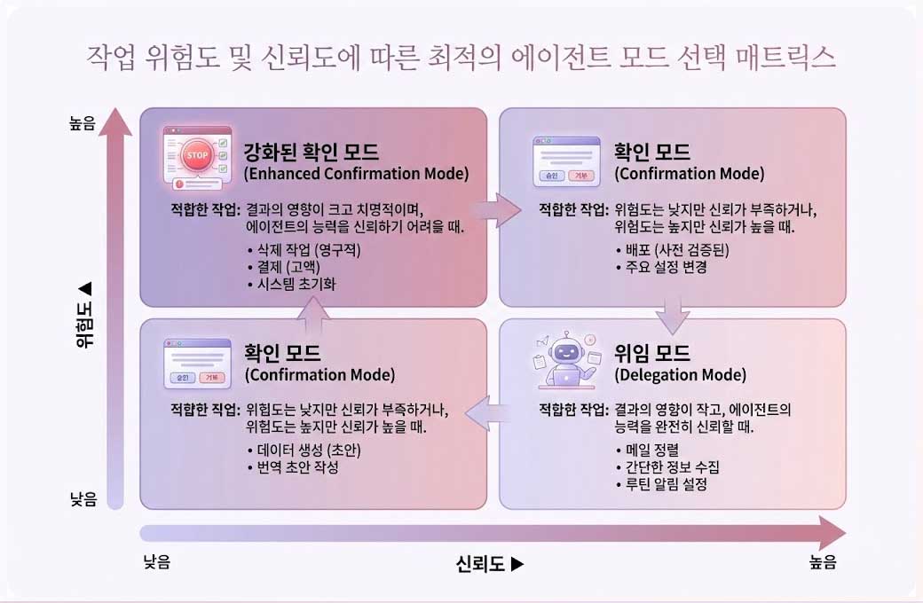 신뢰 점수가 낮을 때 (초기 사용, 또는 오류 이력이 많을 때): 모든 작업에 강화된 확인 모드 적용