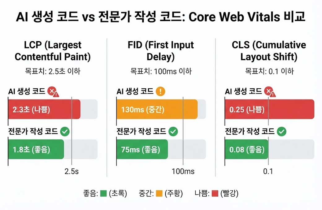 Google의 2025년 웹 개발 실태 조사에 따르면, AI로 생성된 코드의 약 62%가 초기 배포 시점에서 Core Web Vitals 기준을 충족하지 못했습니다.