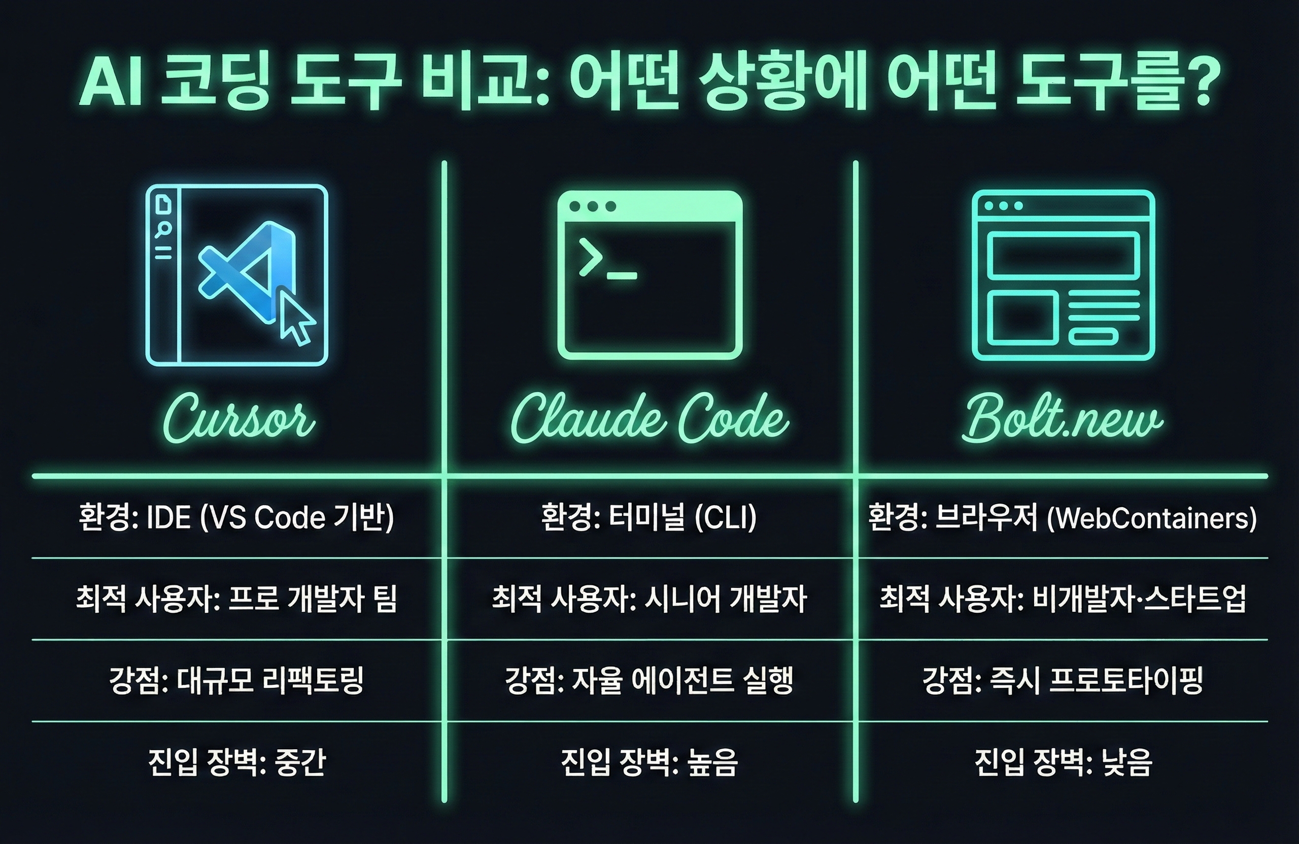 Cursor, Claude Code, Bolt.new는 각각 다른 사용자와 시나리오에 최적화되어 있습니다. 어떤 도구가 '최고'인지가 아니라, 어떤 맥락에서 어떤 도구가 적합한지를 이해하는 것이 핵심입니다.