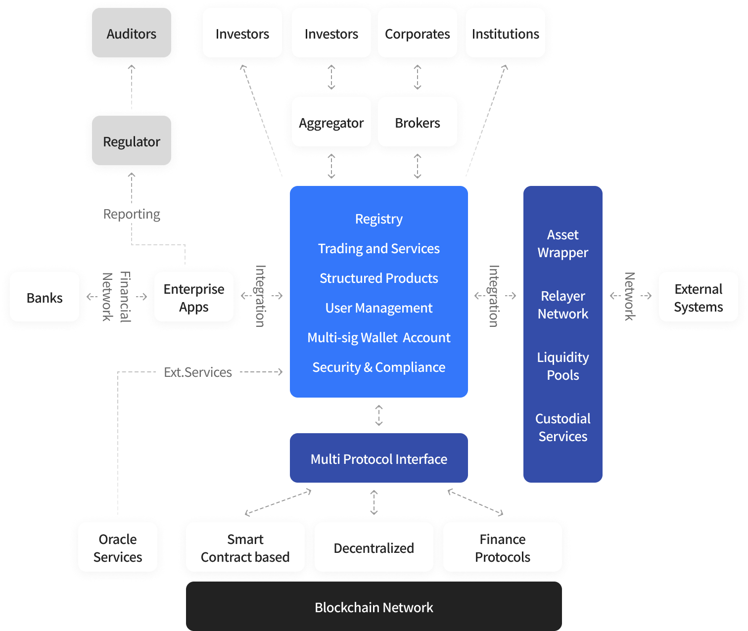 엔터프라이즈 레벨의 통합 디파이(Defi) 프로토콜을 통해 다양한 기관 및 기업의 니즈에 따라 안전하게 호환되는 탈중앙 금융 인터페이스 설계 하고 구축합니다.